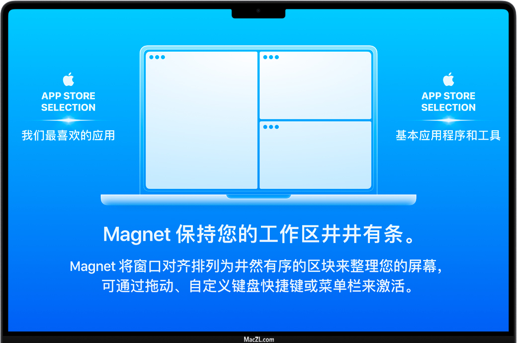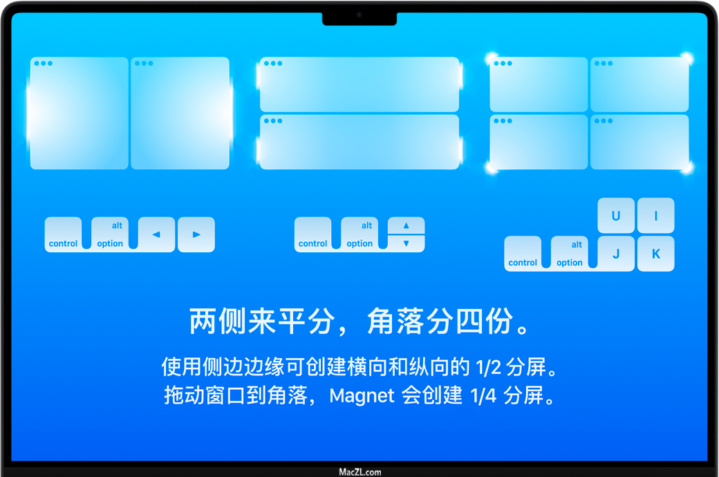 通过拖动、可自定义的键盘快捷键或通过菜单栏激活,Magnet通过将窗口对齐到有组织的图块中来整理您的屏幕。
