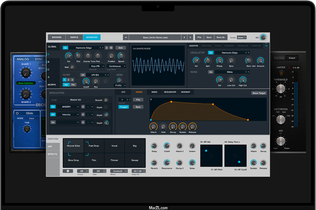 - 使用一系列提供模拟、波表、调频、加法、粒子、频谱和建模合成的合成器,演奏灵感迸发的声音