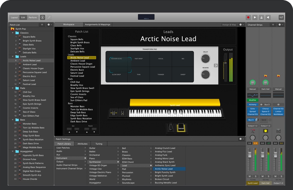 终极现场演出装备使用 100 种乐器、效果和 MIDI 插件进行现场演奏,或使用音频单元插件 从 Logic Pro 和“库乐队”添加声音,将录音室声音带上舞台 支持 MacBook Pro 上的触控栏,提供便捷的布局、编辑和演奏控制 将乐器与诸如键盘和声乐等现场音频组合起来,形成单个 Patch 无需停止声音输出或切断长音符,即可在多个 Patch 之间切换 使用拆分与分层、自动琶音器和其他 MIDI 插件来设计各种各样的键盘 Patch 使用“播放”演奏立体声或多轨伴唱轨道 64 位架构使用系统中的所有内存来处理较大的采样乐器