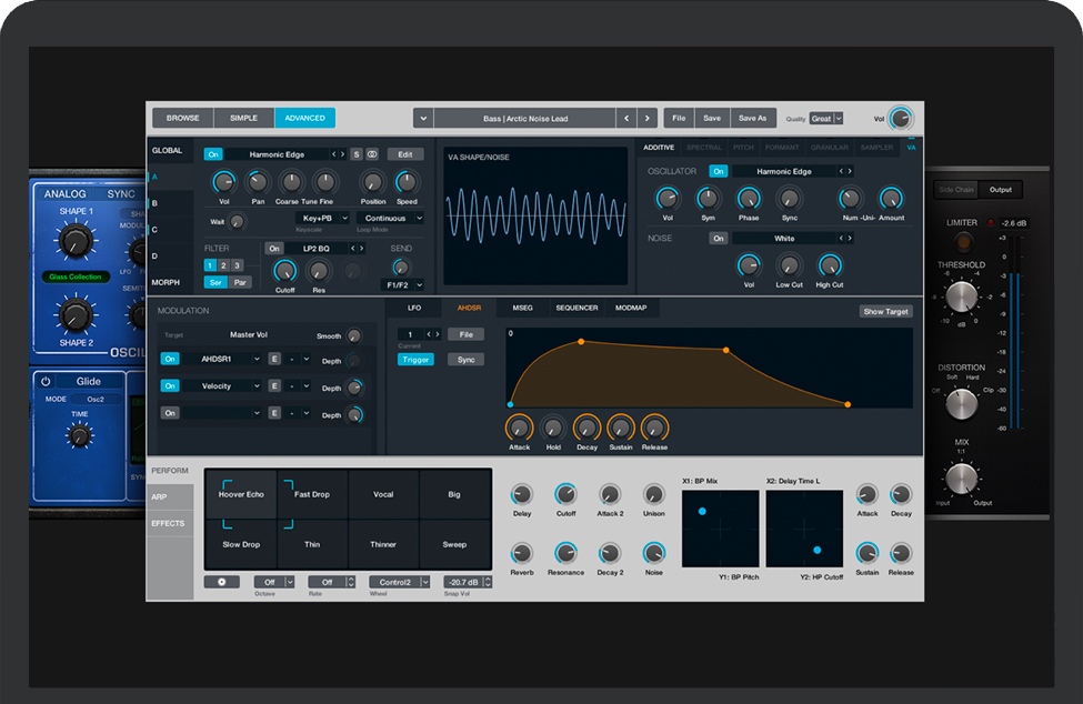 乐器插件通过 Sampler 和 Quick Sampler 弹奏或创建各式各样的多重采样乐器 使用自动采样器插件将喜爱的硬件合成器变为采样乐器 通过终极样本处理合成器 Alchemy,快速查找声音或创建独一无二的新声音 使用 Retro Synth 弹奏具有经典的 70 年代和 80 年代风格的合成器声音 使用 Vintage B3、Vintage Electric Piano 和 Vintage Clav 弹奏古典键盘的仿真模型 使用一系列提供模拟、波表、调频、加法、粒子、频谱和建模合成的合成器,演奏灵感迸发的声音 弹奏由 Drum Kit Designer 提供的经过深度采样、专业混音和完全可自定的架子鼓 使用 Ultrabeat 电子鼓乐器演奏电子乐节拍