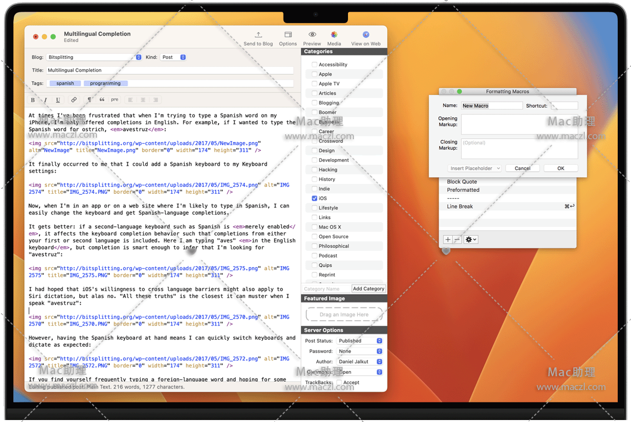 MarsEdit 支持特色图片、文章格式和多作者模式。它甚至支持添加自定义字段,这些字段会直接显示在文章编辑器窗口中。