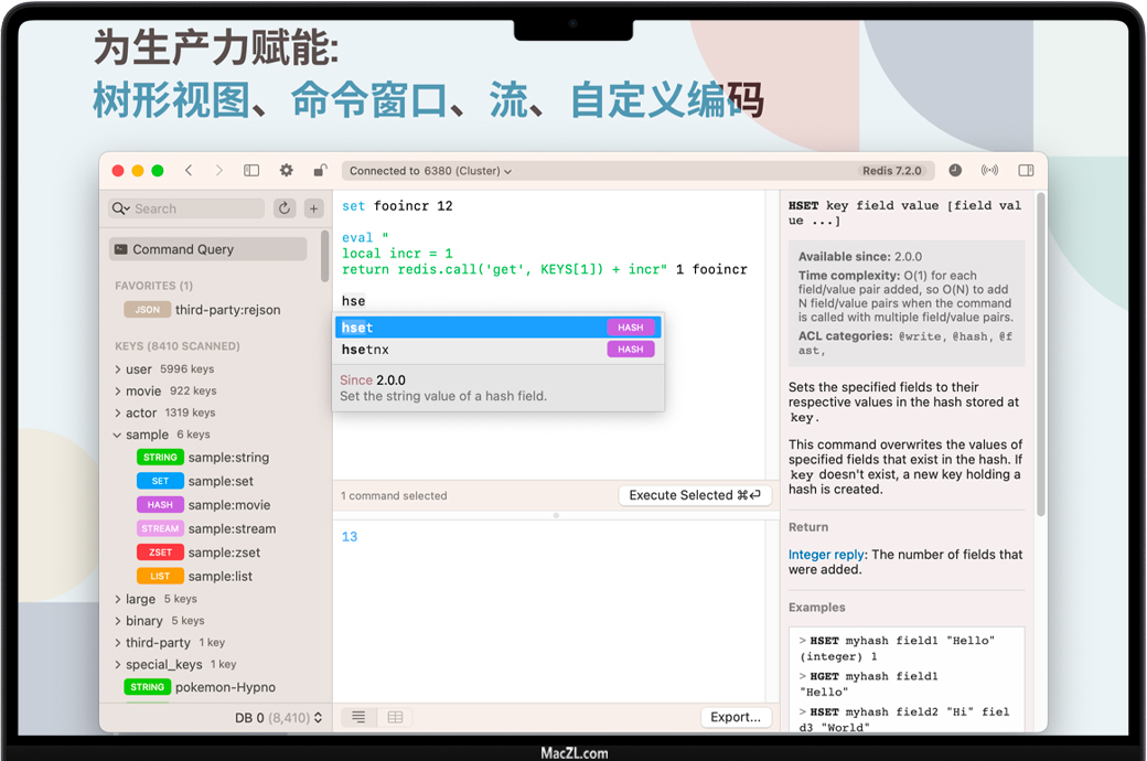 Medis 提供了一个查询视图来运行任意的命令。查询视图支持高亮关键字,并能实时显示相关帮助文档,使一切都超级易用。