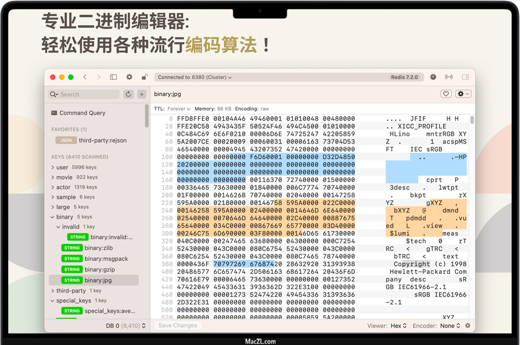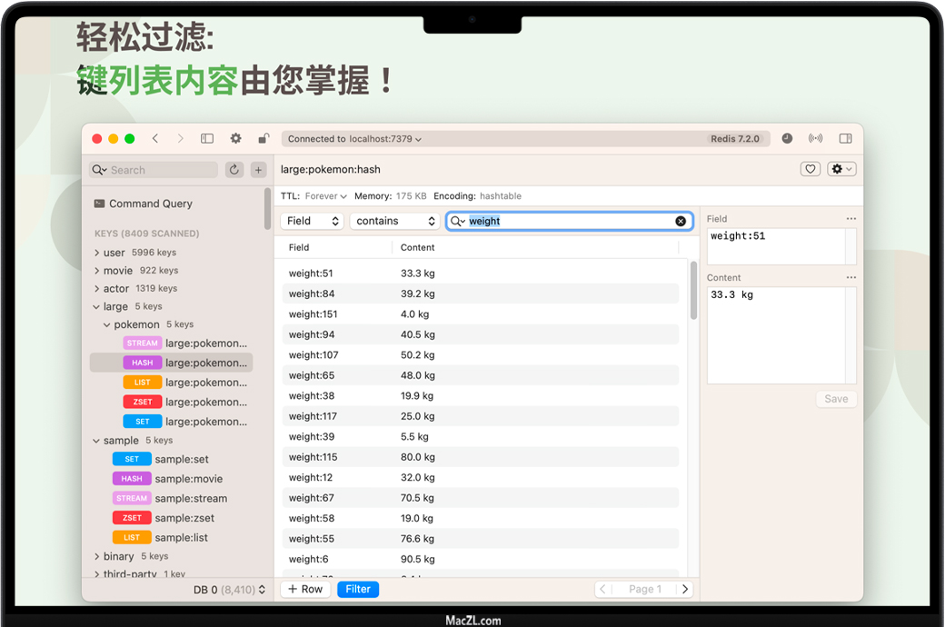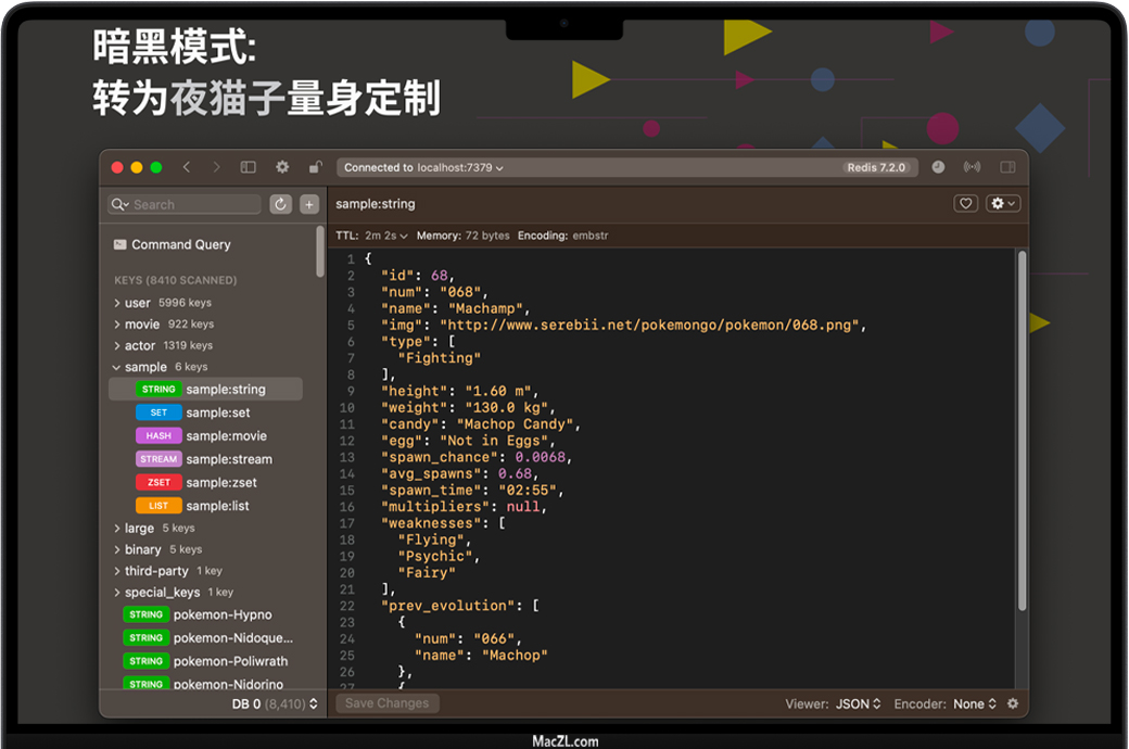 Medis 对字符串、列表、哈希、集合、排序集合、流,甚至一些第三方模块(如 RedisJSON)都提供了专门的支持。通过漂亮的用户界面,用户可以愉快地管理所有数据。