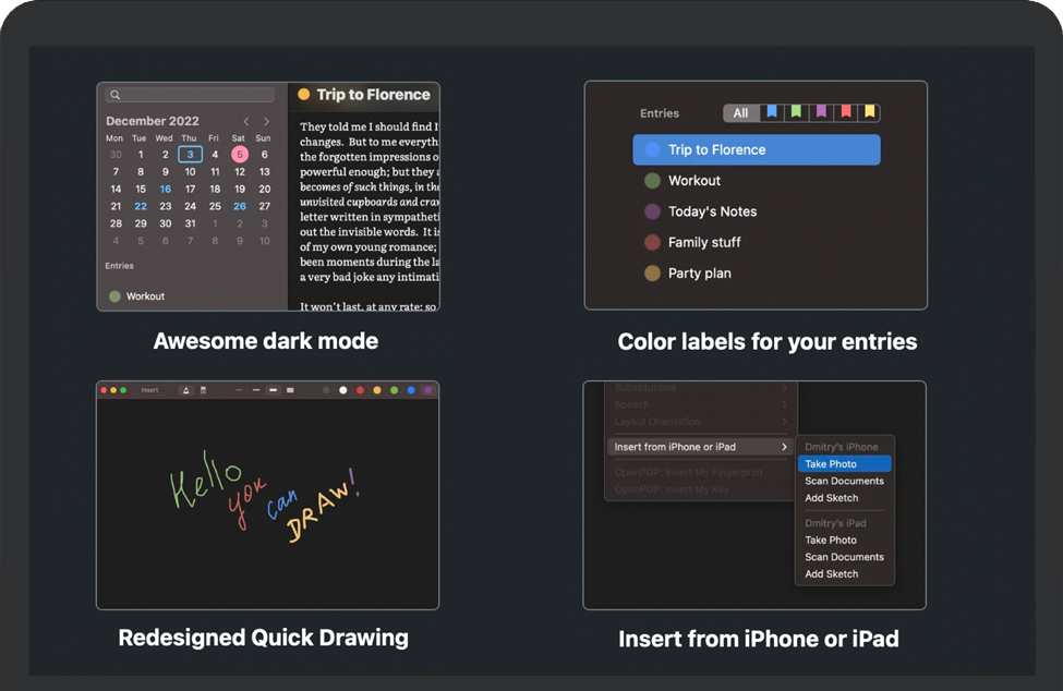 很棒的黑暗模式。它甚至会自动将文本和绘图调整为正确的颜色。并查看条目标题栏中的模糊效果。您的条目的颜色标签。用颜色标签对您写的内容进行分组,然后按标签轻松浏览条目。重新设计的快速绘图。现在具有橡皮擦、触控栏支持和更好的颜色,适用于白色和深色背景。从iPhone或iPad插入。使用iPhone或iPad在Mac上直接添加照片、绘制草图或将文档扫描到Mémoires中。
