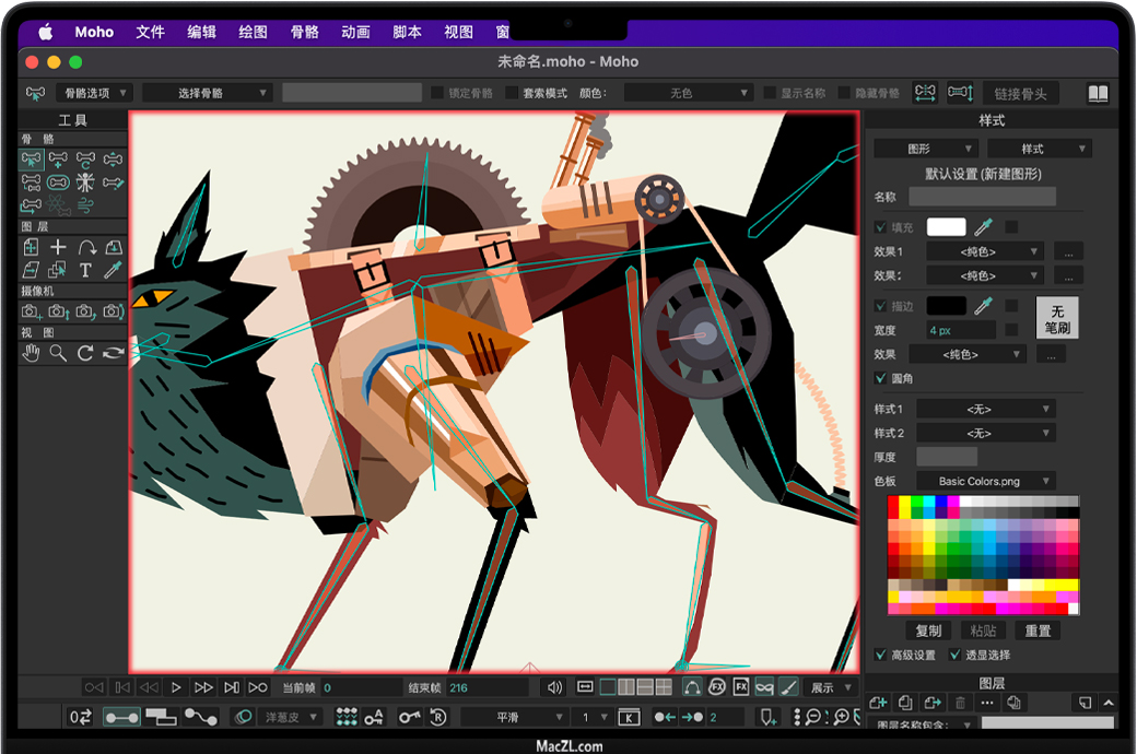 Moho for Mac 是一款功能强大的2D动画软件,它结合了最强大的动画技术和最先进的专业动画工具。轻松绘制、装配和动画。您可以直接在Moho中使用为动画优化的矢量工具创建角色,或者导入图像或Photoshop文件,以保持链接和分层结构。