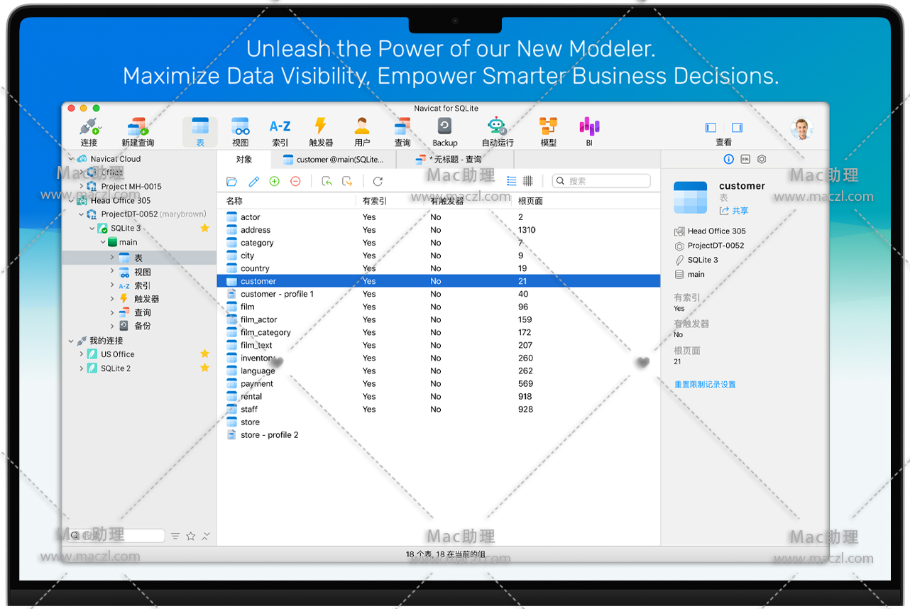 Mac版Navicat for SQLite 是一个功能强大且全面的 SQLite 图形用户界面,提供了一整套用于数据库管理和开发的功能。优化您的 SQLite 工作流程和生产力——您可以快速且安全地创建、组织、访问和共享信息。