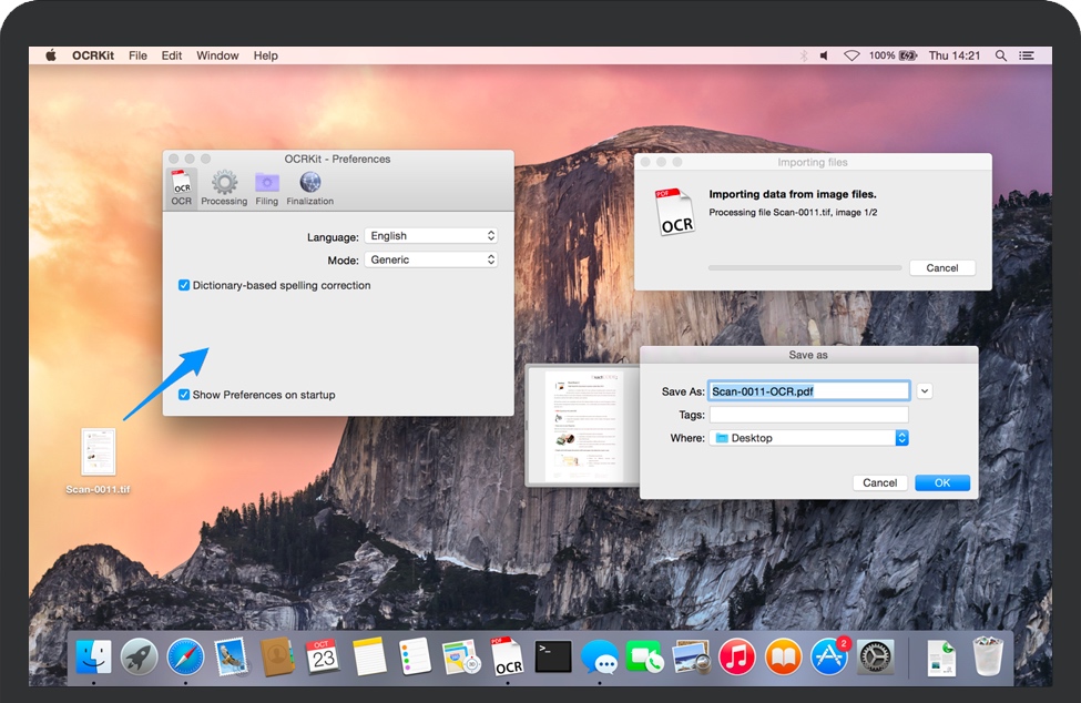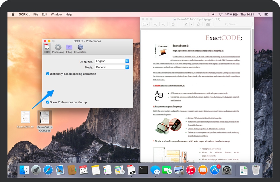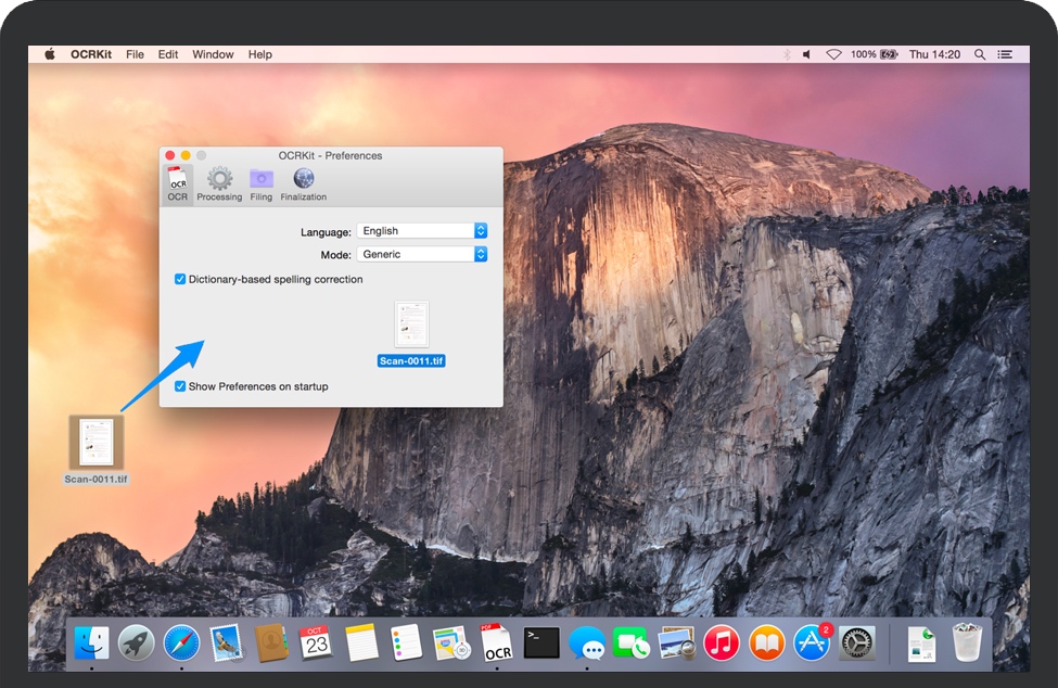 只需拖它工作起来非常简单,只需将文档拖到应用程序停靠图标中,或者使用 OCRKit 应用程序打开文档(打开方式 > )。 |
