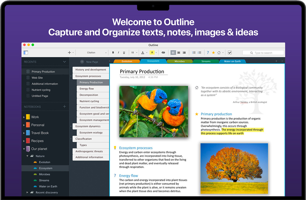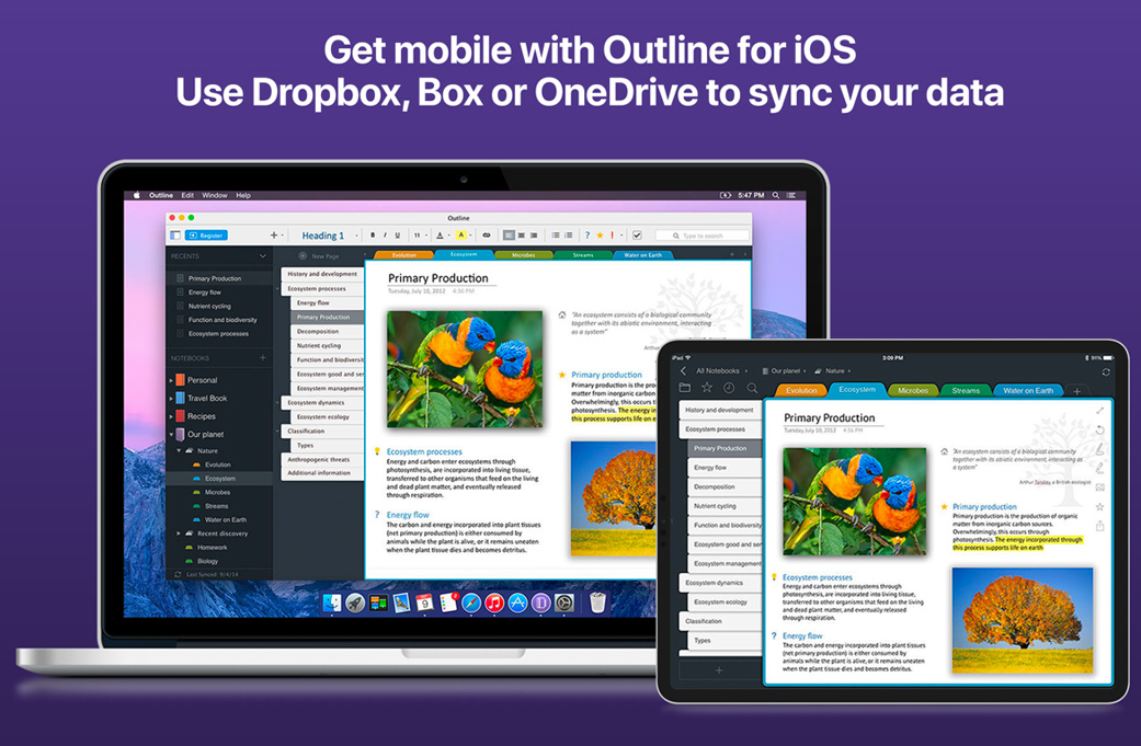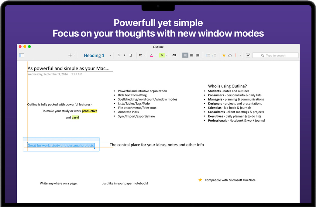 Outline for Mac 是一款优秀的笔记软件,在Mac上的笔记类软件中,如果论软件的易用性和界面设计,Outline绝对要比知名的印象笔记和OneNote要优秀很多倍,Outline能够兼容微软OneNote格式,支持Dropbox、Box、SkyDrive数据同步,加密、添加附件、Retina屏幕等功能,非常强大的一款笔记软件!