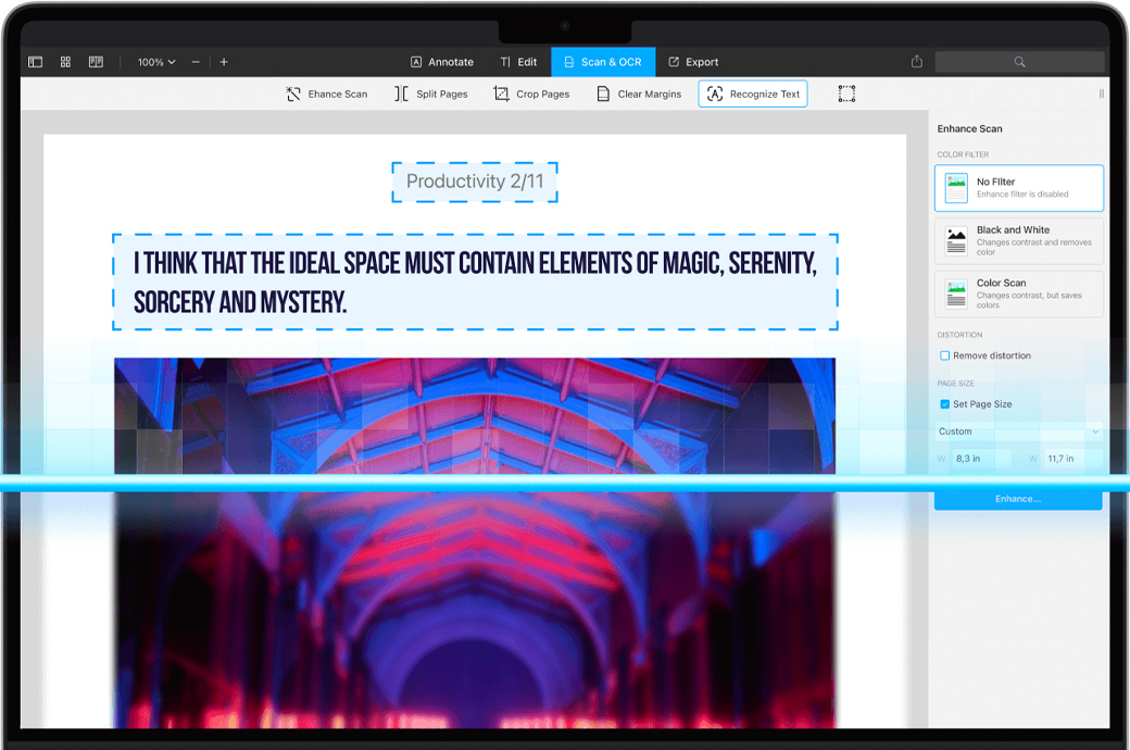 修改对比度、缩小白边、拆分页面。精修已扫描 PDF,移除变形、阴影、黑边。