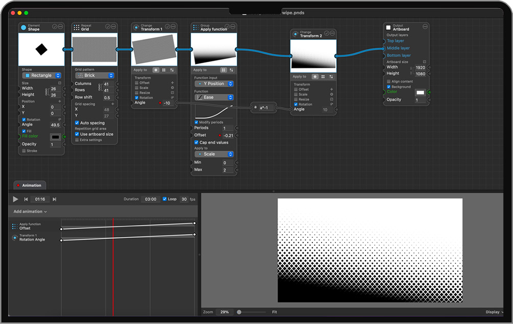 Patternodes是完全无损的,因此您可以随时更改序列中的任何步骤,而无需重做任何事情。这使得调整重复计数或元素属性变得容易,并立即看到最终结果。控制每个节点的参数也可以连接到其他节点,从而建立一个属性控制另一个属性的复杂关系。最后,所有这些节点参数都可以使用时间轴中的关键帧进行动画处理。