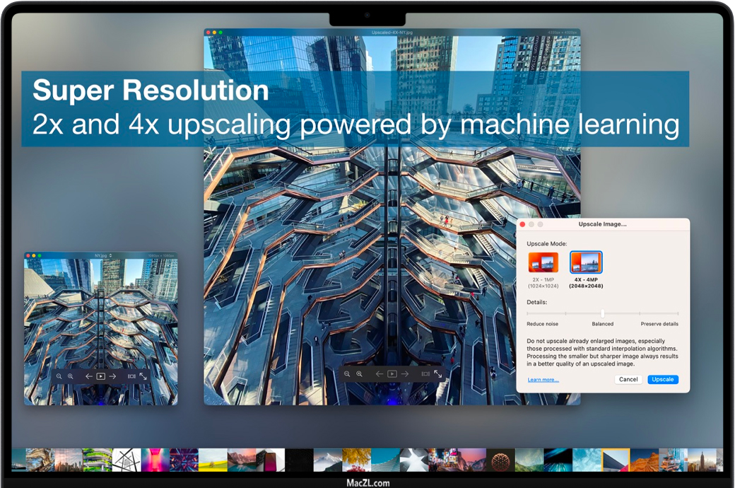 由机器学习提供支持的 2 倍和 4 倍升级。该算法通过分析数百万张图像进行训练。锐化和放大照片而不会丢失其内容。