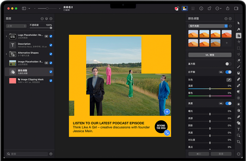 新界面极富现代感的单一窗口界面专为 Mac 上的图像编辑设计 直观的设计易于所有人使用——无论你初学者还是老司机。 Pixelmator Pro 提供明暗两种界面,无缝适应 macOS 的浅色及深色模式。