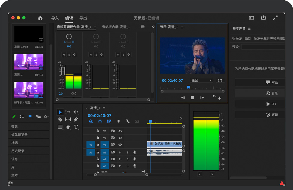 修剪模式下的播放循环选项“修剪”模式现在支持从播放指示器所在位置开始循环回放,而不是从最近的编辑点开始。 | 重新混合的进度指示器“重新混合”可智能调整歌曲时间,使音乐和视频相匹配。在对音频剪辑应用“重新混合”时,新的进度指示器会显示“重新混合”正在分析剪辑。 | 对Sony Venice 2摄像机的支持Premiere Pro现在支持Sony VENICE 2摄像机文件格式。 |