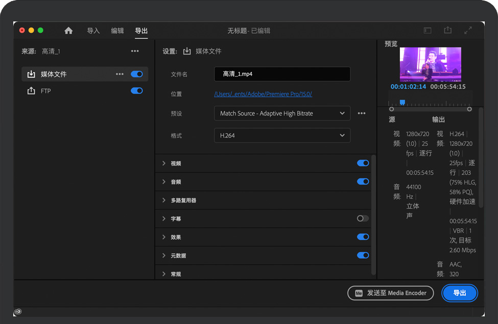 重新设计的导出新设计专门针对内容的目标位置(包括YouTube、Facebook和Twitter等社交平台),从而简化导出流程。Premiere Pro可针对每个目标位置提供推荐的输出设置。自定义自己的目标位置和预设,以提高效率。 | 全新标题栏使用“导入”、“编辑”和“导出”选项卡在 Premiere Pro 中更轻松地导航,以访问创作过程的主要阶段。标题栏还提供对工作区的快速访问、快速导出和全屏播放。 | 导出预设管理器使用新的预设管理器访问现有的导出预设,保存自己的自定义预设,或者导入或导出预设进行共享。通过快速导出或新的导出模式打开预设管理器。 |