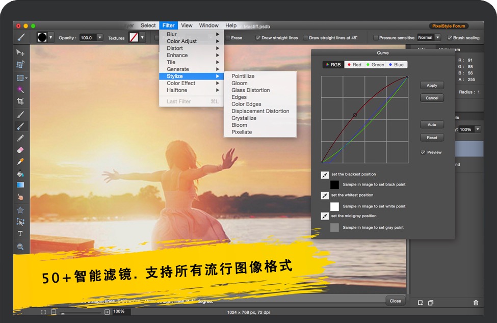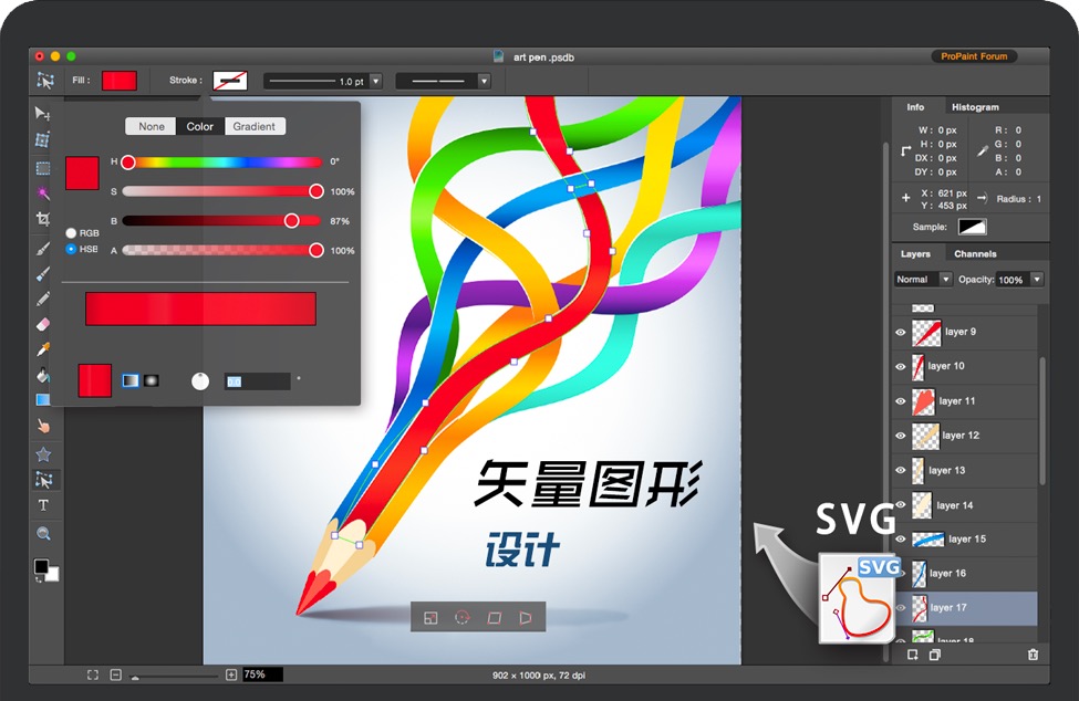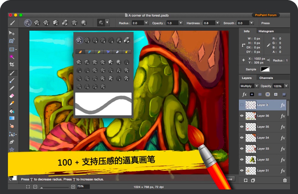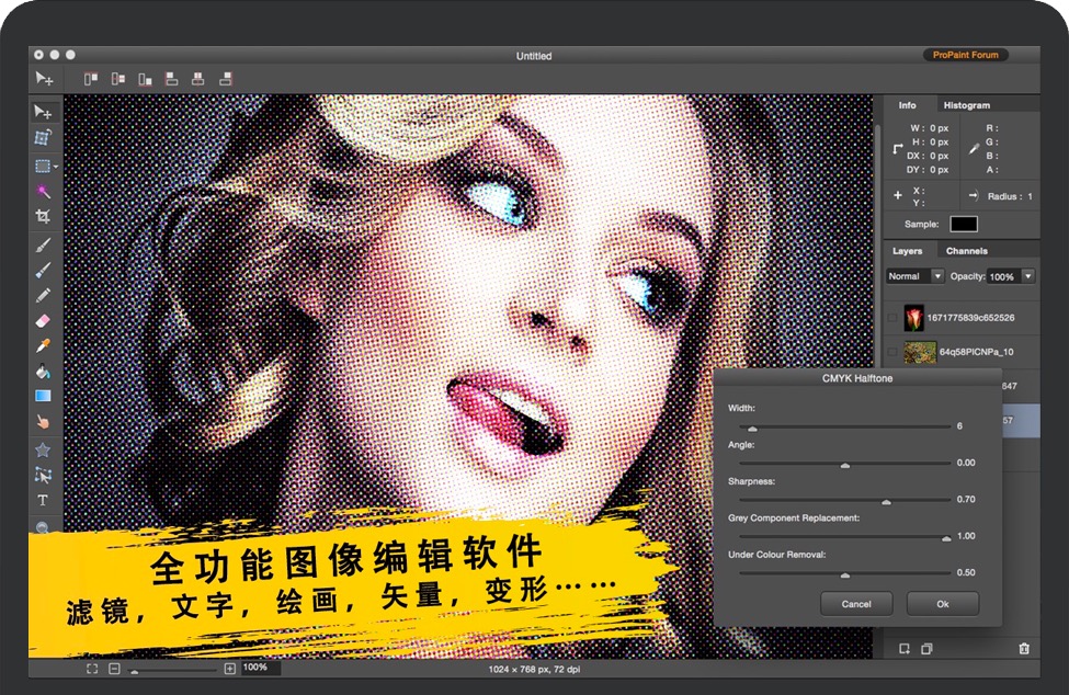 ProPaint for Mac 是一款逼真的数字绘画工具,可用于在Mac上编辑图像、矢量图形设计、自由格式转换、添加滤镜、裁剪、Alpha 通道编辑等。ProPaint为Mac上的原创艺术作品创作提供了高质量的图像处理工具。非常方便地转换任意图片和绘画作品到PDF,AI,SVG和DXF矢量图标。随意拉伸不模糊。