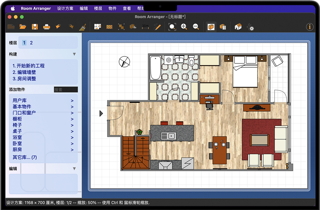3D 可以给您对于自己的设计有更好的观感。Room Arranger 不只能让你穿梭于现场, 也能让你以拟真的行走模式徒步浏览。