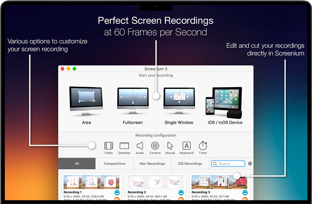 Screenium 3 for Mac会为您对这些类型的设备创建最流畅的录像,并安全的确保平滑的屏幕质量。
