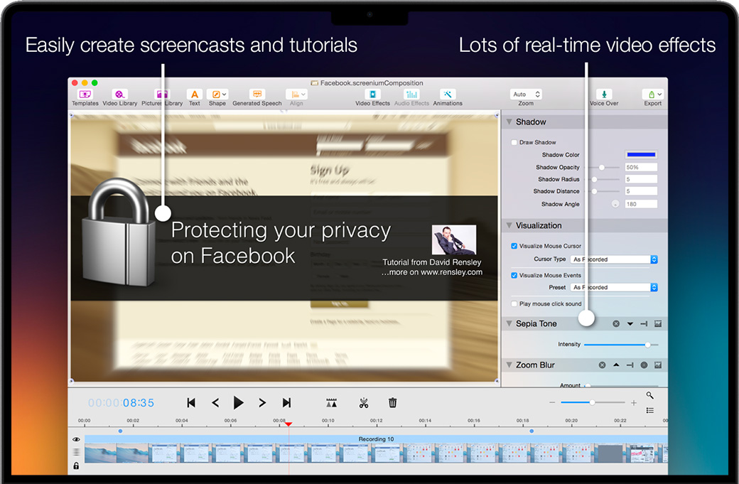 Screenium for Mac舒适而强大的视频编辑器为您提供了需要剪切连续镜头、嵌入文本或添加特效、切换效果或动画的所有工具。