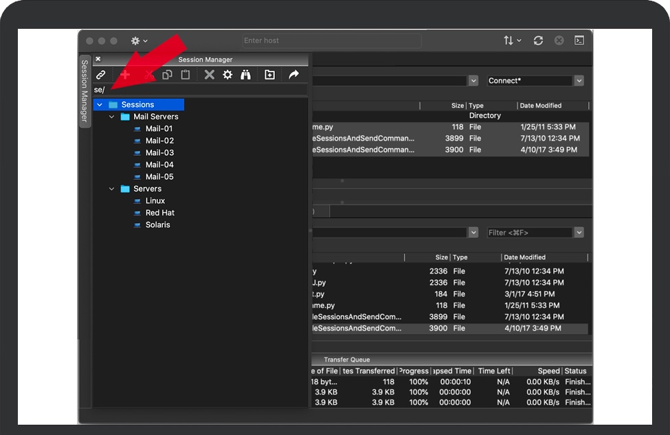 通过在连接栏或会话管理器的过滤器栏中键入部分会话名称,在文件夹中组织您的会话并快速访问您的会话。