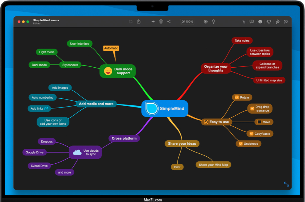 SimpleMind Pro for Mac 是一款轻量的思维导图软件,可将您的Mac变成头脑风暴,创意收集和思维结构设备。思维导图可帮助您整理想法、记忆事物并形成新的创意。SimpleMind Pro界面漂亮而直观,可供您随时随地使用。SimpleMind Pro for Mac功能很强大,贴图、表情、注释、结构、幻灯片模式应有尽有。