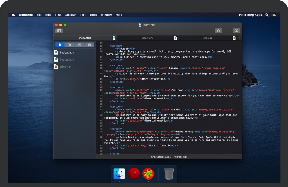 Smultron 12 for Mac 是一款优雅且功能强大的文本编辑器。您可以使用 Smultron 12 创建或编辑任何文本文档。不论是网页、笔记还是脚本代码。支持众多编程语言的代码高亮功能。Mac Smultron 12处理速度非常快,并使用了诸如自动保存之类的技术。使用 Smultron 12 for Mac 可以满足您的所有对于文本编辑的需求。