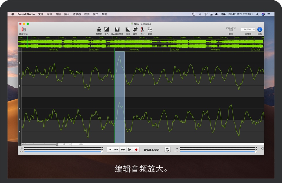 使用 Sound Studio,用户可录制专业的音频播客及其它音频对话。并以同等的高保真度录制和编辑对话、演讲、演示、音乐及其它音频。另外,通过这款高质量的程序能手,还可将文件保存成多种标准文件格式,如 AIFF、WAVE、MP3、MPEG-4 AAC、Ogg Vorbis 等。