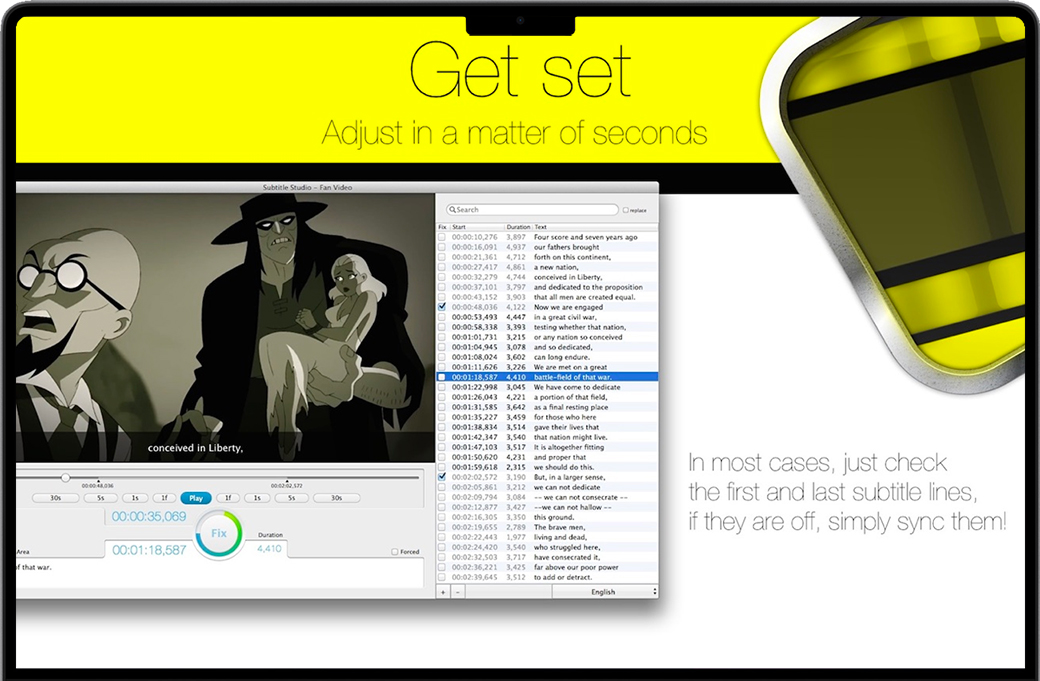 活到现在你讨厌同步不好的字幕吗? 你对所有的错别字感到恼火吗? 您是否对过早字幕的破坏者感到沮丧? 您是否在寻找一个同步良好的字幕上浪费了很多时间? 你害怕甚至创造你自己的吗? Subtitle Studio可以让那些噩梦消失! 容易…都在那里,使用起来很有趣: 点击save,你就完成了! 字幕工作室功能:完整的 M4V(还有 MP4、MOV)工作流程:提取、编辑、嵌入 支持其他格式:AVI、MKV(有限)等等…… 电影转换为 M4V(我们强烈建议在 M4V 中工作) 将您的字幕嵌入到新的完全优化的 M4V 文件中,适用于 AppleTV、iPhone、 iPad 和所有其他典型播放器 保存到 SRT 从 srt、sub、txt、ass、ssa 读取(使用内部网络搜索时为 zip) 导入 SubRip、SubViewer、MicroDVD、Sub Studio Alpha 文件 支持自定义编码,适用于 Windows 文件以及日文、西里尔文等。 创新的 Tap2Sync – 当你有文字,但没有时间 添加多种语言 添加相同语言的多个版本 字幕工作室为您整理字幕文件 直接搜索Open Subtitle(仅限 Subtitle Studio) 在 WebBrowser 中搜索许多站点的目录(仅限 Subtitle Studio) 从头开始创建您的字幕 修复第一行和最后一行,剩下的交给字幕工作室 字幕移位 或者修复单个字幕 直接字幕文本编辑 键盘快速编辑 电影免费编辑 搜索字幕文本 轻松搜索和替换功能 删除不需要的行 添加字幕行(想想缺少的场景等) 添加任意数量的字幕语言