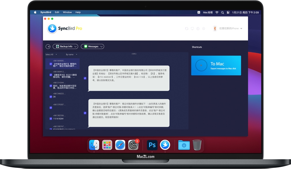 如果您在iTunes中备份iPhone,iPad或iPod touch,则将拥有一份信息副本,以备万一设备被更换,丢失或损坏。但是,仅当您从以前的备份还原设备时,才能访问这些存档的数据。SyncBird Pro可以让您即时访问iPhone备份,以便能够导出所需的特定iOS数据,例如消息,联系人,便笺,Safari历史记录,书签等。
