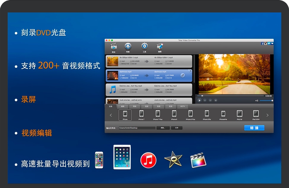 Total Video Converter Pro高级版本,是一个非常强大,全功能的转换器,视频编辑器和DVD刻录机,支持几乎所有的视频和音频格式。 主要特点:批量转换视频和音频文件到iPhone, iPad, iTunes, PS Vita, iMovie, Final Cut Pro。 高速刻录标清SD和高清HD视频到NTSC / PAL制式的DVD。 整合录屏软件,支持录制屏幕并输出无损视频。 提供直观交互的时间线编辑所有视频格式。 逐帧精确裁剪和剪辑视频和音频文件。 自由给视频添加喜欢的背景音乐。 自动导入DV视频(AVCHD/TOD/MOD),并很容易地转换到iMovie, FCP和其他移动设备。 合并多个视频片段为一个专业好看的电影。 从视频文件中无损提取视频和音频。 从视频文件导出GIF动画图像。 增加特效效果如翻转, 旋转, 灰色, 平滑, 使您的视频与众不同。