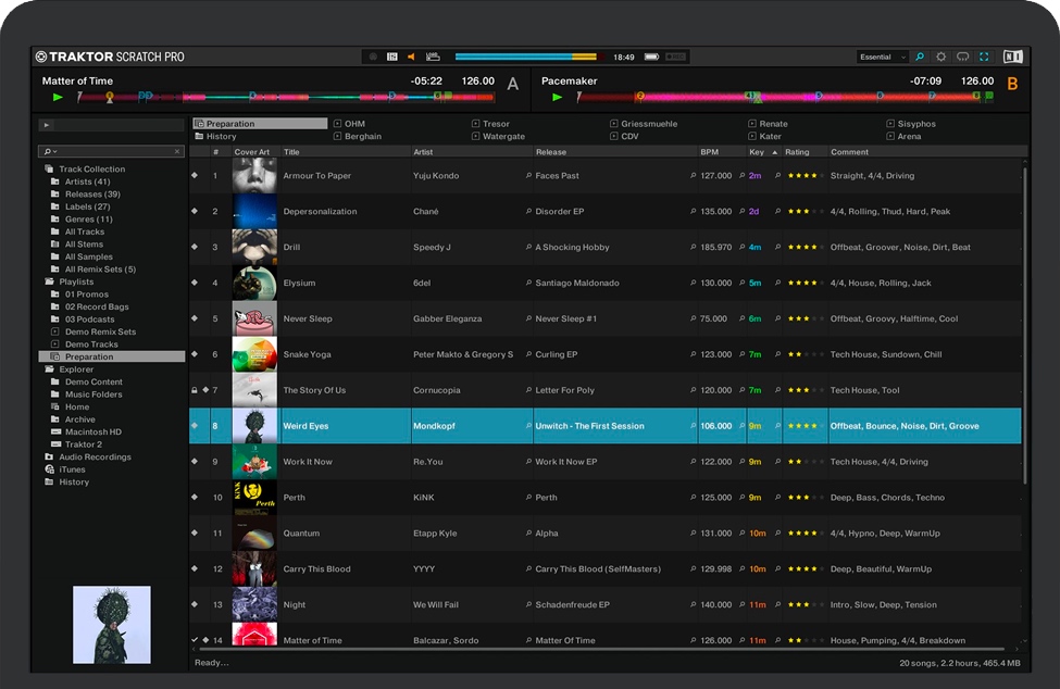 您音乐资料库的编排能在 DJ Set 中直观的表现出来——良好的音乐管理是适应舞池的最佳技巧。TRAKTOR 的播放列表、iTunes 资料库的直接读取,以及可定制的精选分类,让您可以找到任何您想要播放的歌曲,甚至比如几个月前收到的存放在您音乐资料库角落的音乐也是。Smartlists(智能播放列表)能让您结合您偏好选择来创建新的播放列表。列表会随着您新增的曲目而立即更新 - 从 16bpm workouts,Dj tools 到欢快的过门,一切都已准备就绪,静候您的派遣。