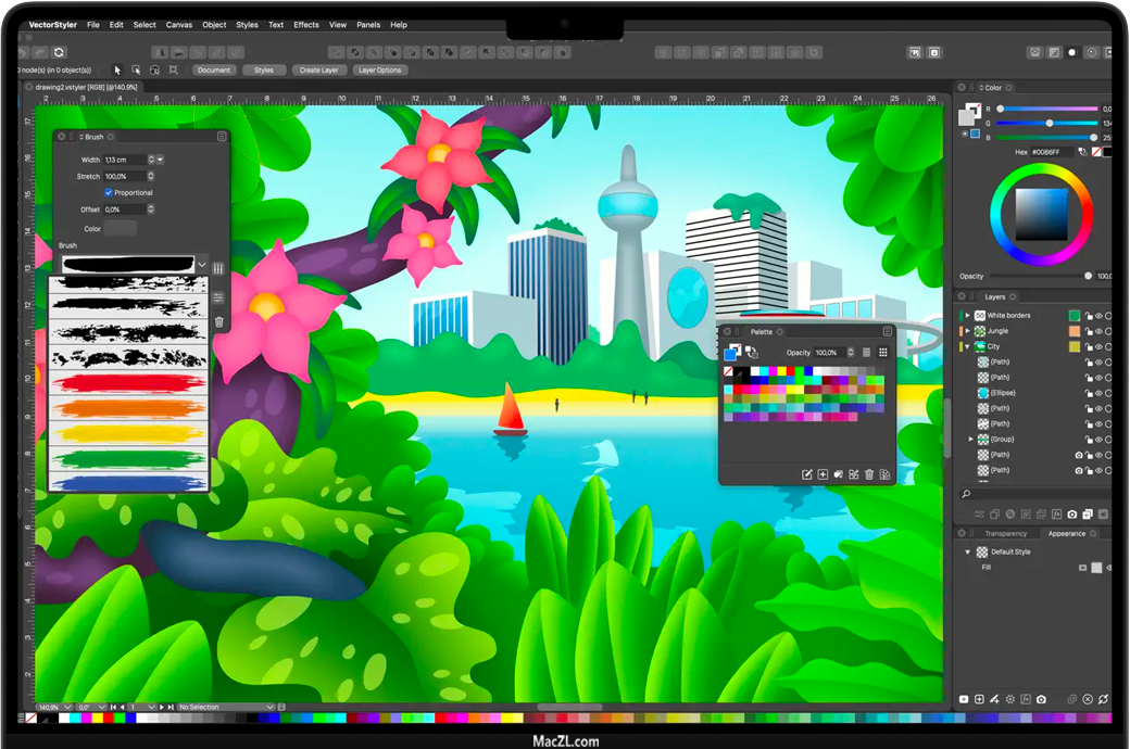 VectorStyler for Mac 是一款先进的插图和矢量图形软件,具有大型新功能集和工作流改进。VectorStyler的开发目标是提供设计师和插图画家熟悉的所有功能,同时引入新的创新功能。为屏幕、印刷品和网页创建插图、徽标、图标、绘图、版式、矢量艺术。在任何形状上放置和编辑文本。路径对齐上的文本可以链接到形状,以便随着形状的更改而动态更新。使用节点工具将点文本的基线拖动到曲线中。路径上的文本可以使用弯曲效果来实现平滑的字形扭曲。