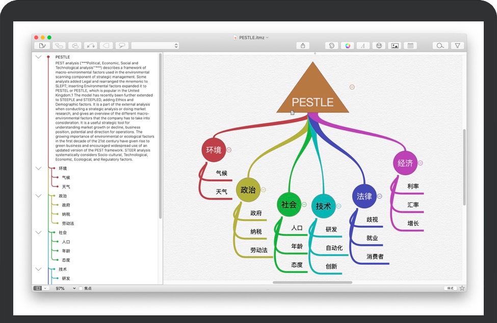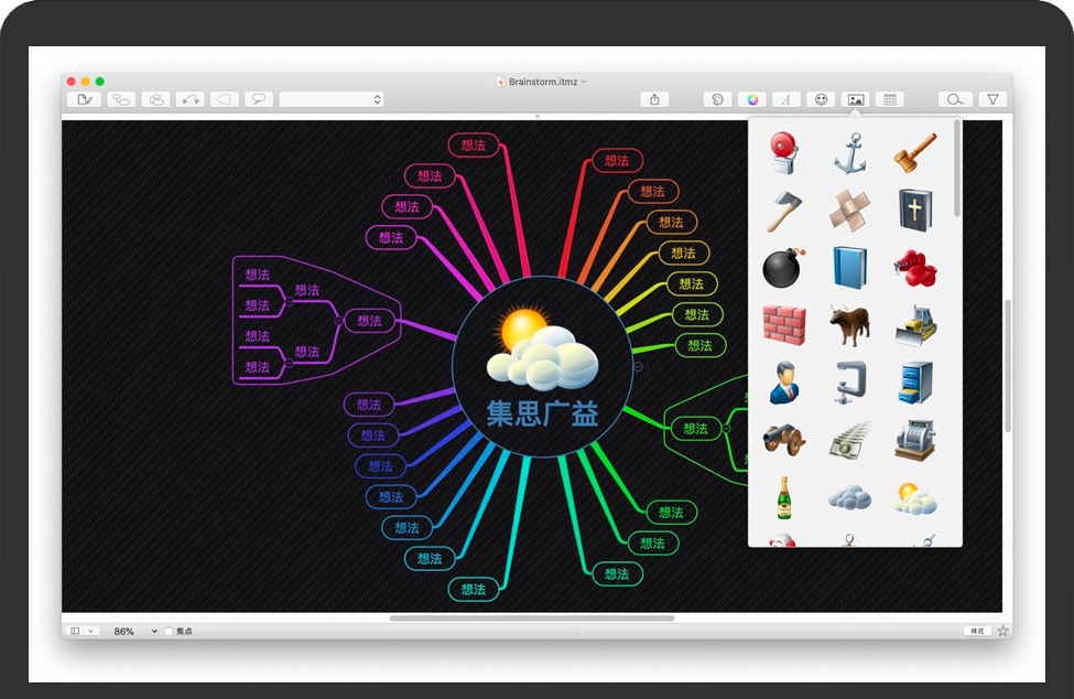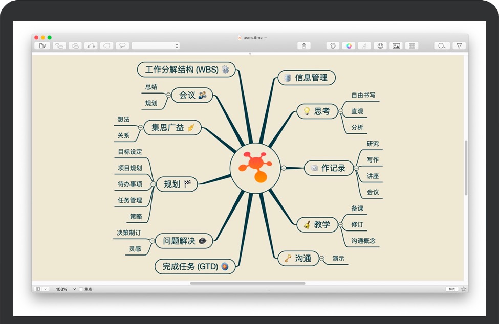 iThoughtsX for Mac 是一款优秀的Mac思维导图应用,它可帮助您直观组织想法、主意和信息。典型应用场景:任务规划、会议总结、集思广益、项目规划、设定目标、工作分解结构 (WBS)、 课堂讲义/修订、会议记录、完成任务 (GTD)。 iThoughtsX支持大部思维导图软件的格式。支持导出为:PPTX、DOCX、MS Project (XML)、PDF、PNG、Markdown、HTML 、Things、iCloud 日历/提醒事项。支持与 iCloud、Dropbox 和 WebDAV 进行云同步。