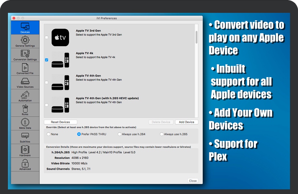 iVI for Mac 是一款专业的苹果视频转换软件,iVI是将视频导入iTunes或Plex的最佳方式。iVI支持的视频格式包括:h.265、AVI、MKV、MTS、M2TS、FLV、AVCHD、MOD、TOD、MTS、M2TS、3GP、MP4、MPG和大多数其他流行格式。将任何视频导入苹果电视、电视应用程序、Plex、iOS设备或iTunes,构建一个令人惊叹的媒体收藏。