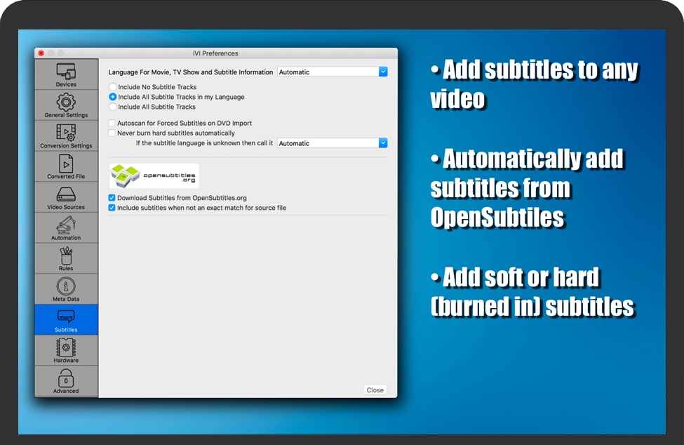 •iVI 支持来自源文件或外部文件的SRT、VobSub、PGS、SSA/ASS字幕,这些字幕可从iTunes、Quicktime、Apple TV、iPhone等访问。