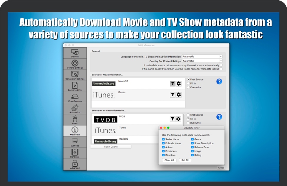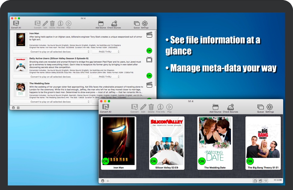 •iVI允许您使用信息(元数据)更新您现有的视频文件,例如节目描述、演员列表、海报艺术,所有这些都可以在 iTunes 中或从桌面显示,而无需重新转换