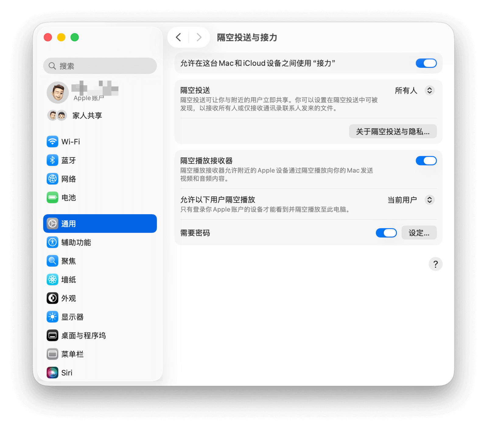 在 macOS Monterey 及之后的版本中,Mac 也可以作为隔空播放的接收器。在「系统设置」>「通用」>「隔空投送与接力」中启用「隔空播放接收器」,即可允许附近的 Apple 设备将音视频内容投放到你的 Mac 上。