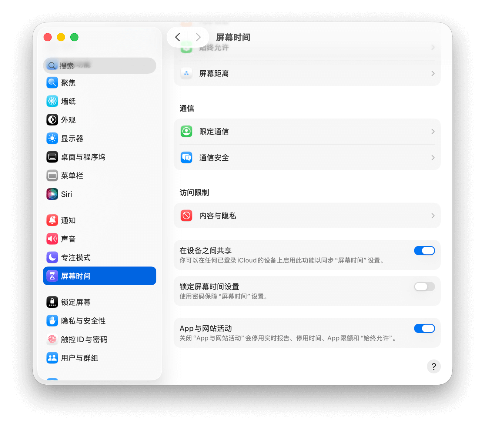 如果你要把 Mac 交给家中的孩子或老人使用,可以开启此功能并设置相关权限,以阻止他们访问不当内容。