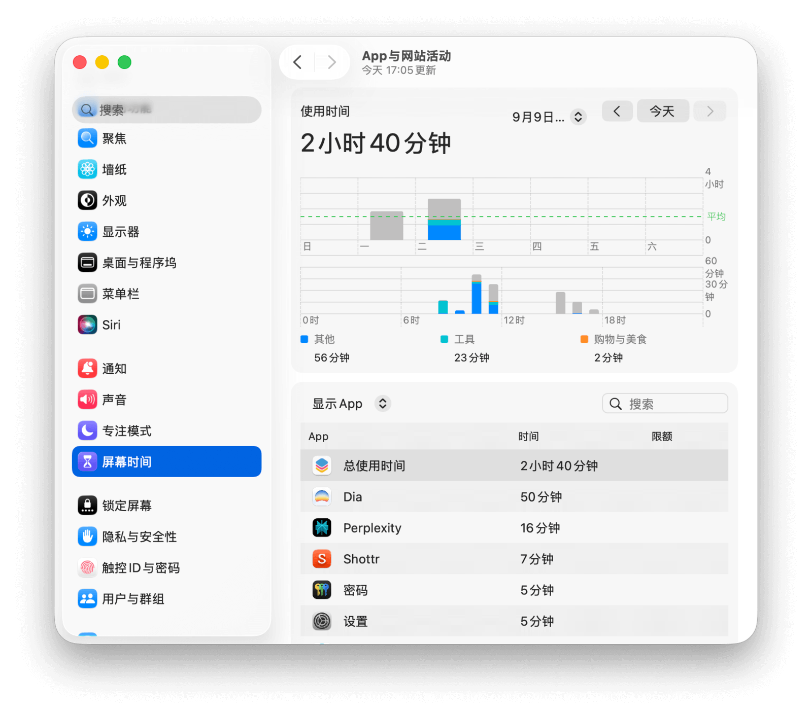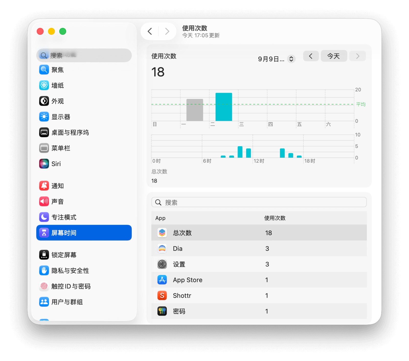 前往「系统设置 > 屏幕使用时间 > App 使用时间」,页面上半部分显示的是你本周平均每天使用 Mac 的时间。你可以在右上角切换周视图和日视图,或查看以往的数据。
