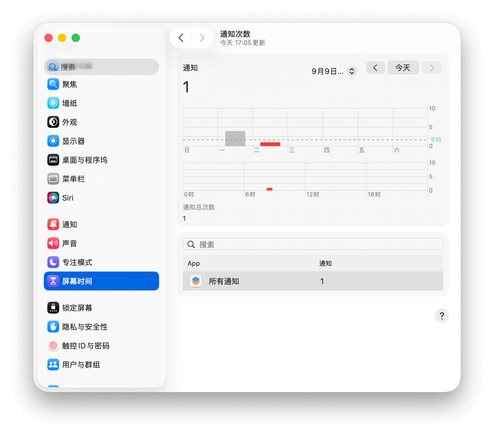 回到「屏幕使用时间」主界面,切换到「通知次数」,可以查看 Mac 收到的通知数量及其来源。许多应用会通过推送通知来吸引你的注意。如果某个应用每天都推送大量无用信息,你可以考虑关闭它的通知权限。