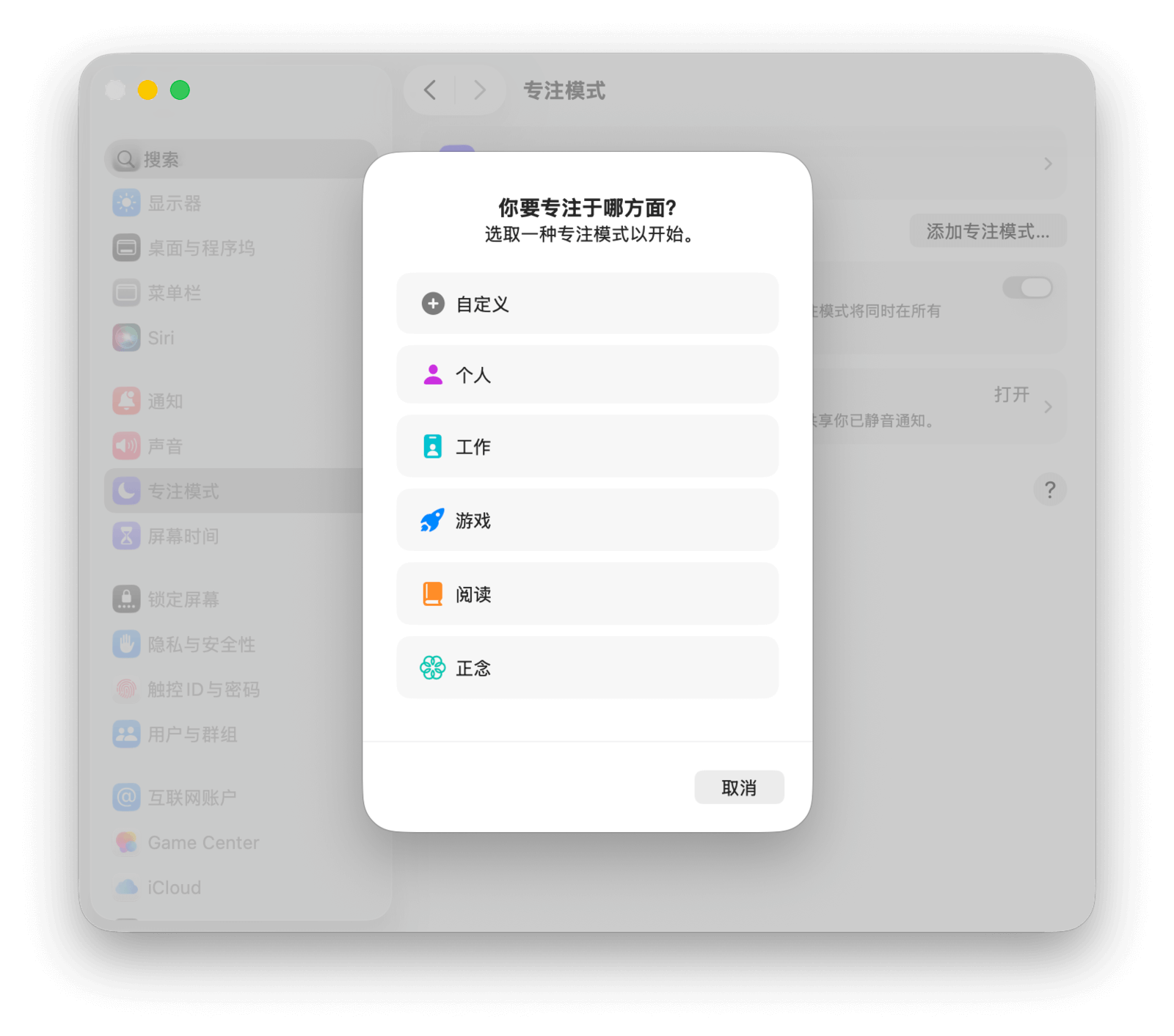 无论是预置还是自定义的专注模式,你都可以在「系统设置 > 专注模式」中修改其设定。