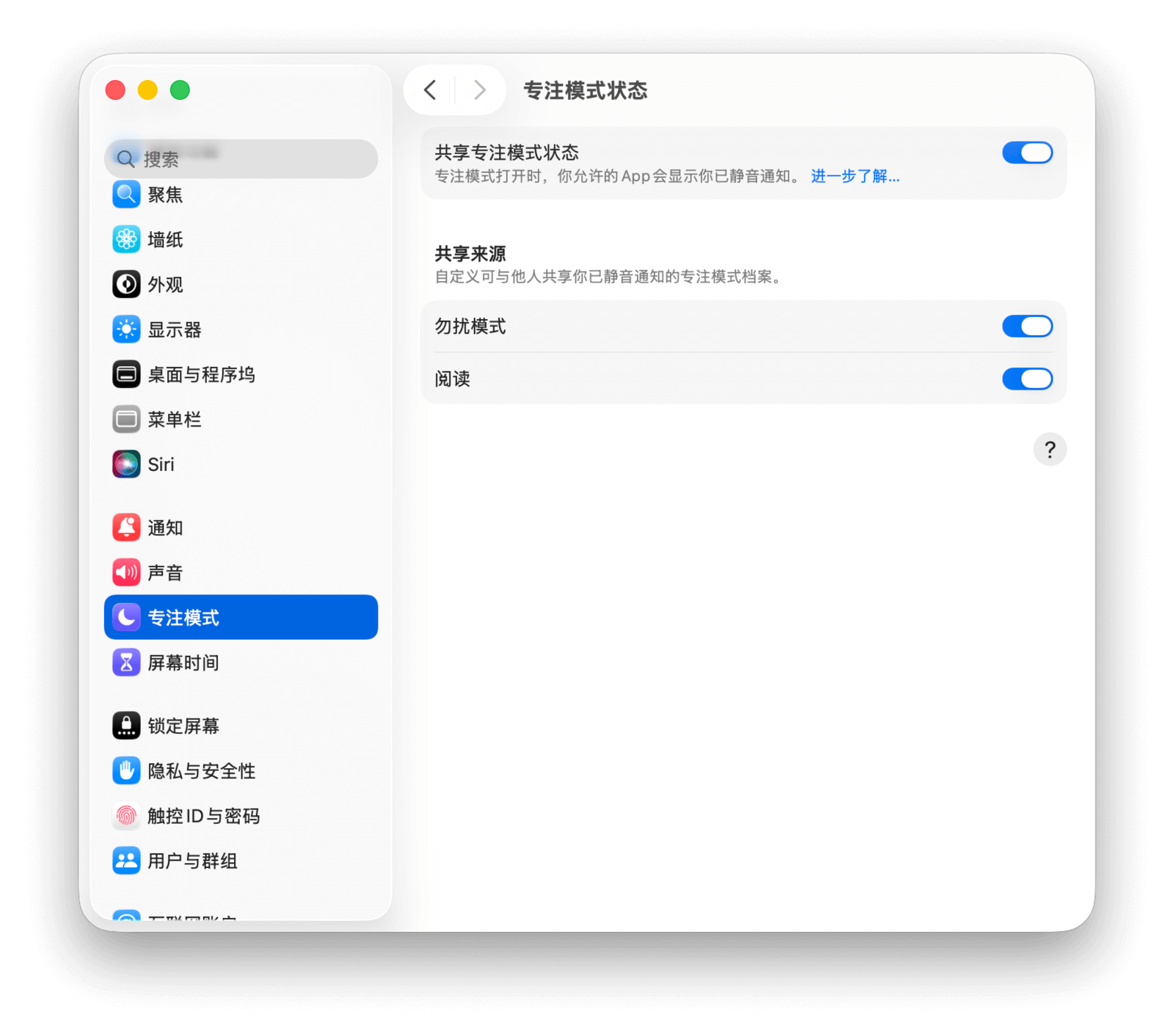 如果你不希望专注模式在设备间同步,可以在以下位置关闭共享: