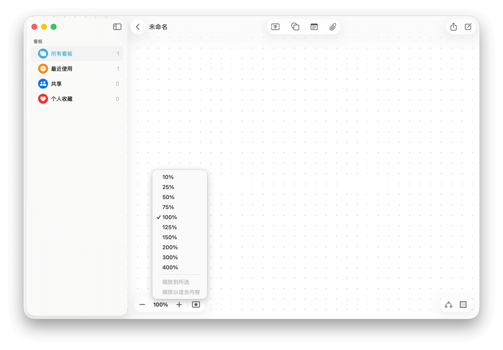 首先,无边记是一款拥有超大画布的白板应用,能让在一块支持 10% 到 400% 自由缩放的画布上创作。虽然名为「无边记」,但将画布缩小到 10% 时,仍可看到其边缘。
