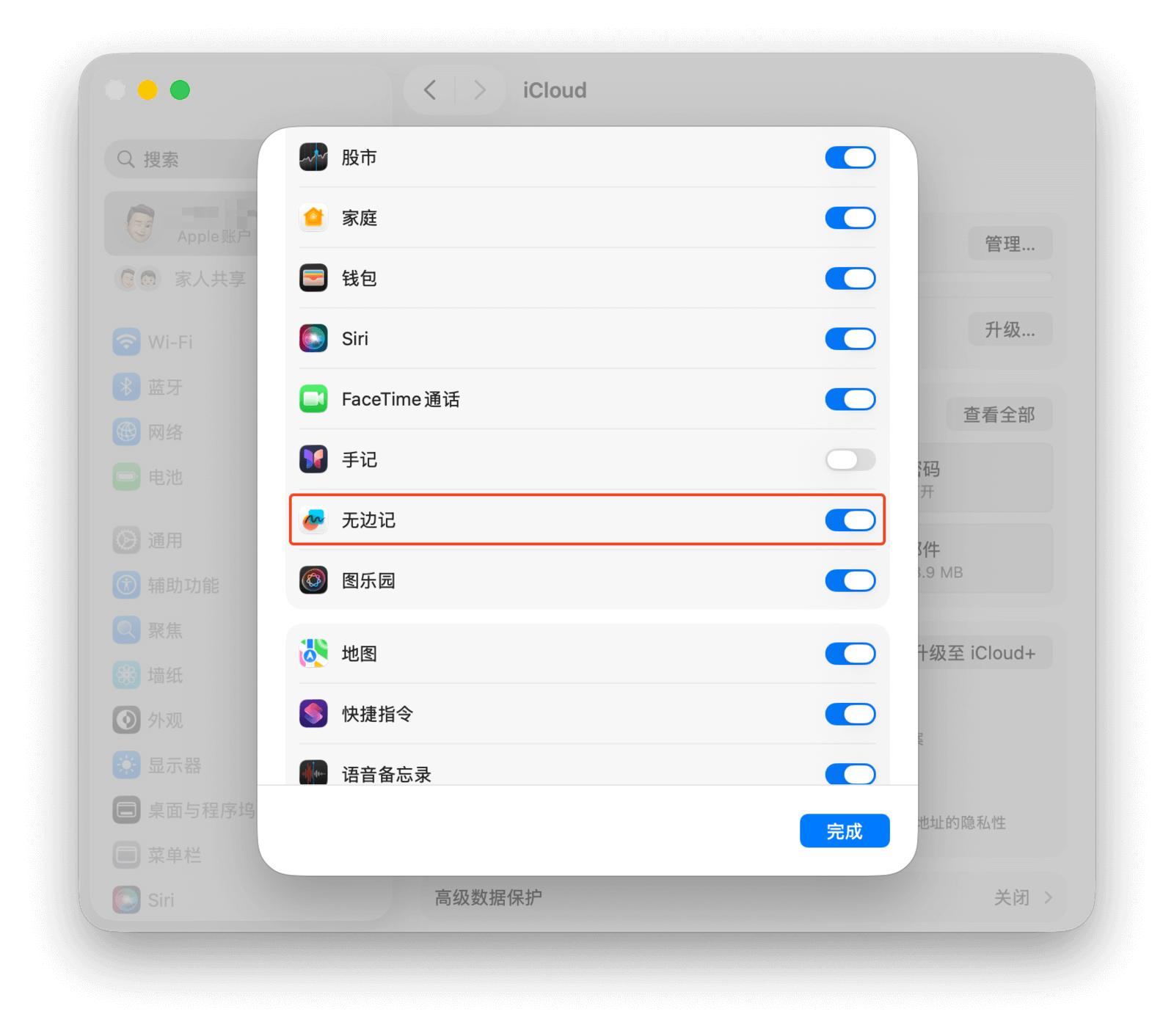 需要注意的是,无边记的 iCloud 同步服务需要手动开启。只有分别在 macOS、iOS、iPadOS 系统的 iCloud 设置中开启无边记的同步权限,才能在无边记 App 中看到同一 Apple ID 账号下其他设备上的画板内容。