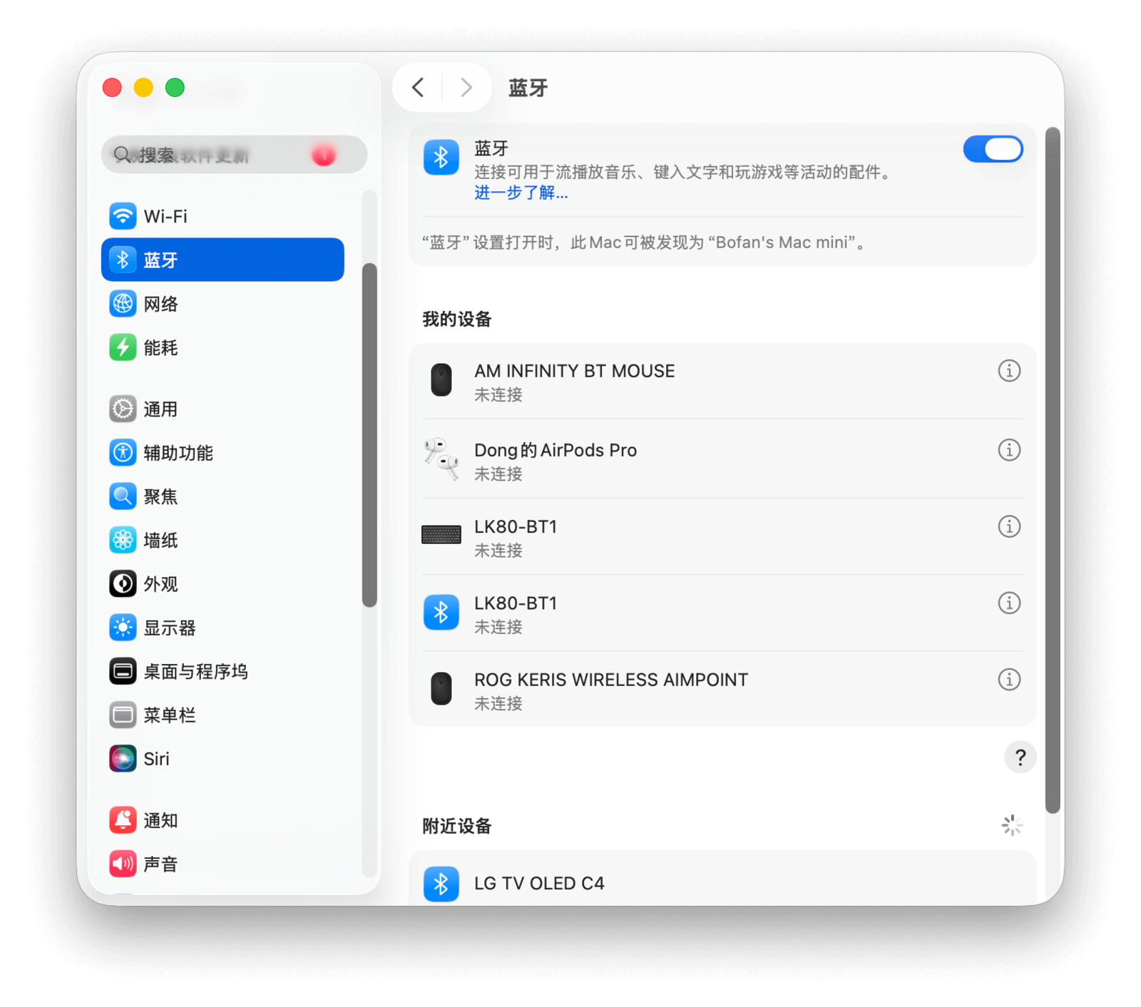 若要通过蓝牙连接,需先开启键盘的蓝牙配对模式(具体操作方法请参考键盘说明书),然后在 Mac 上前往「系统设置 > 蓝牙」,在设备列表中找到该键盘并点击「连接」即可。