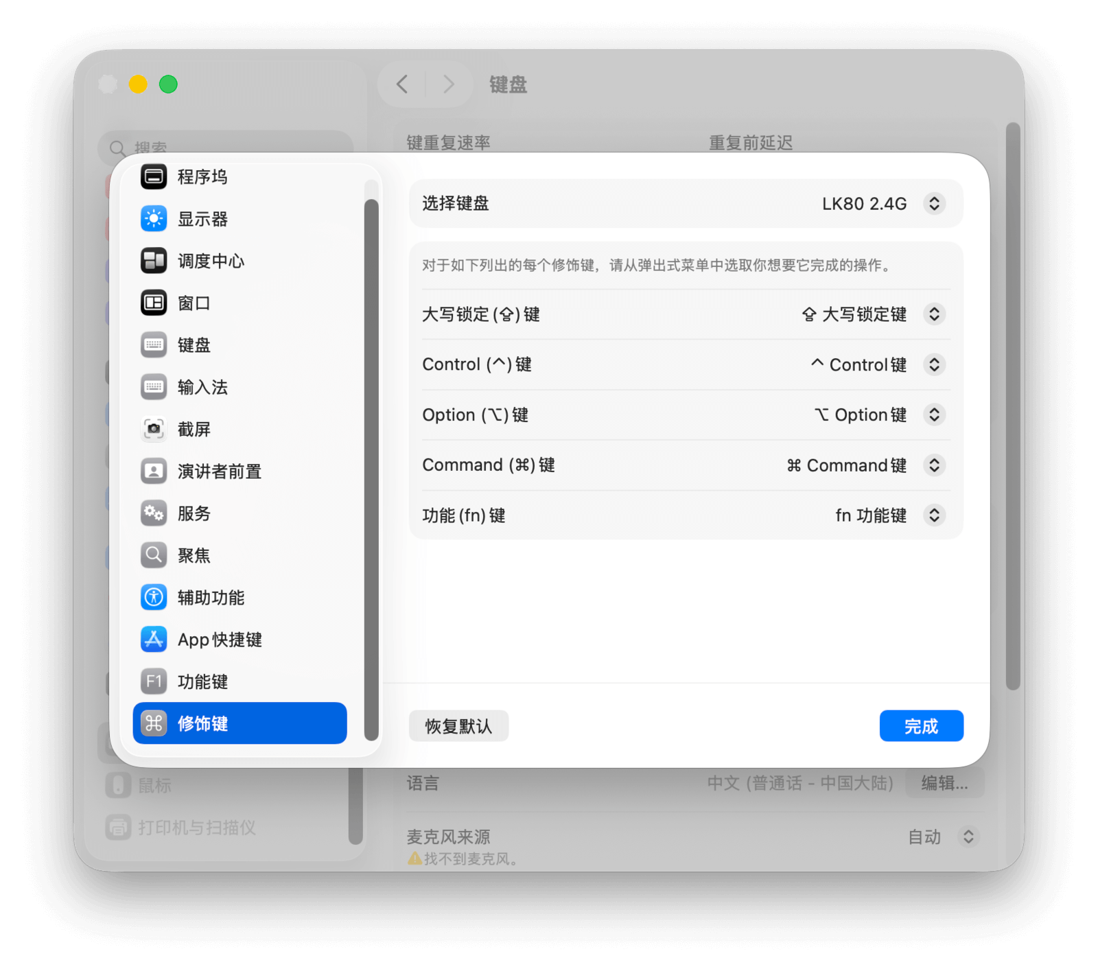 点击「修饰键…」按钮,你可以自定义大写锁定 (⇪)、Control (⌃)、Option (⌥)、Command (⌘) 和 Fn 键的功能,例如将它们互相调换。如果连接了多个键盘,还可以在顶部菜单中选择要配置的特定键盘。