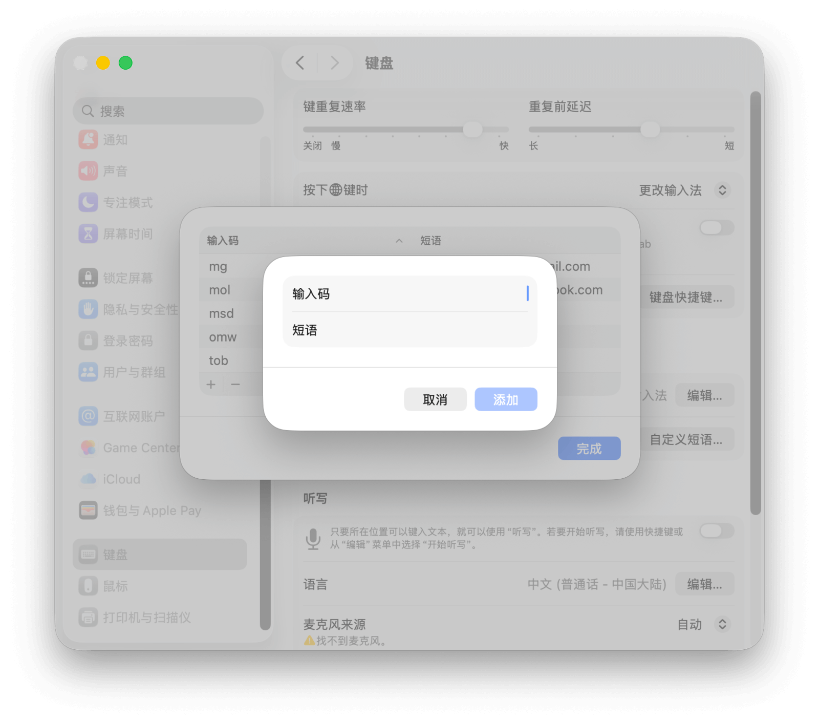 点击表格左下角的「+」按钮即可添加条目。在「输入码」一栏填写简写,在「短语」一栏填写希望替换成的完整文本即可。在系统自带的中文输入法下,该短语会作为候选词出现,方便你选择。