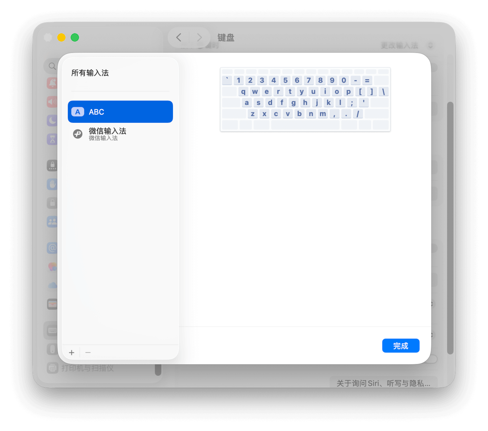 点击左下角的「+」按钮可添加新输入法,选中已有输入法后点击「-」按钮即可删除。