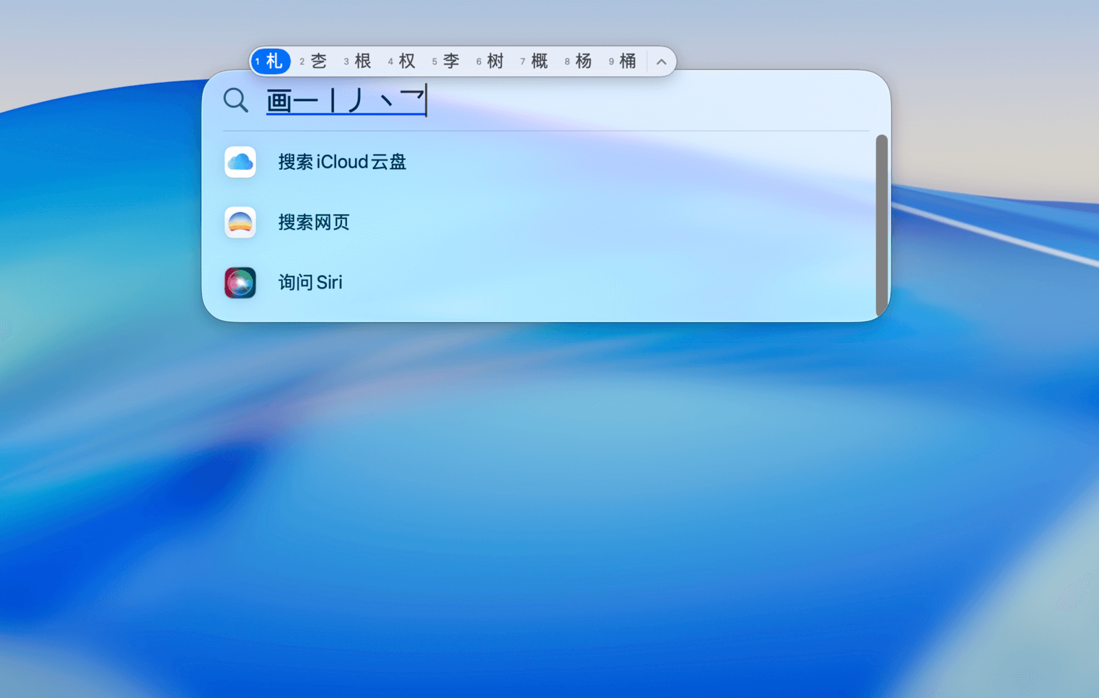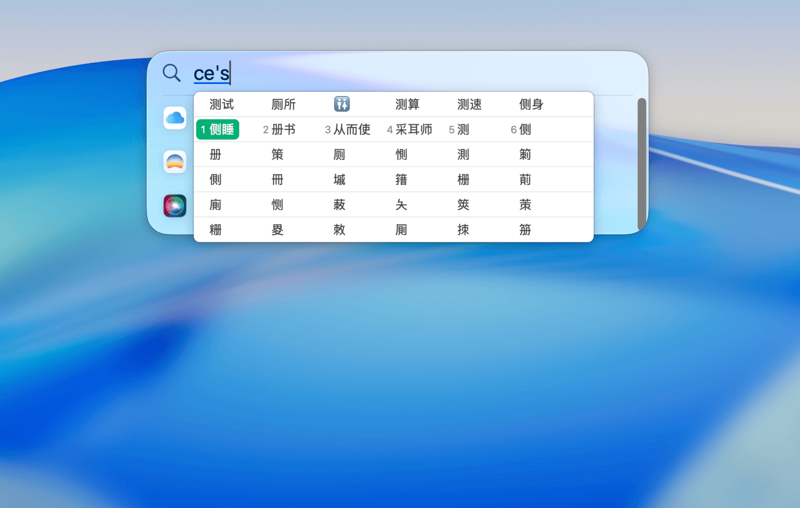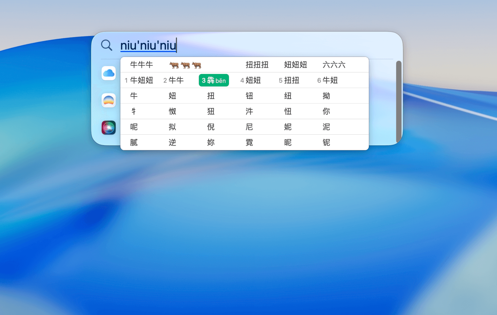在候选词框展开时,可以使用 ⇥Tab 键按部首筛选同音字词。