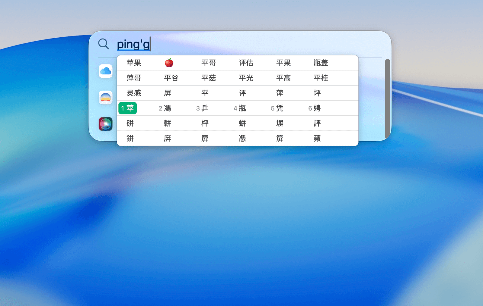 对于拼音相同但声调不同的汉字,在候选词中挨个寻找会很麻烦。此时,你可以使用 ⇥Tab(或 ⇧Shift+⇥Tab)键按声调来筛选候选字。