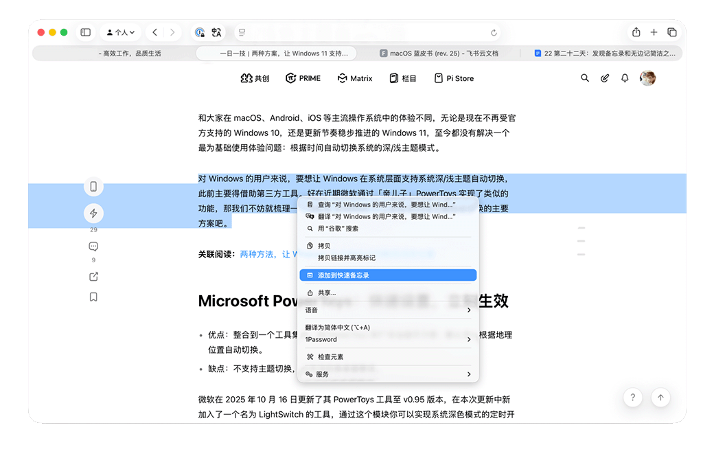 直接选择要高亮显示的文本,鼠标右键点按该文本,然后选取「添加到快速备忘录」。此时 Safari 浏览器中的文本会高亮显示,并且在快速备忘录中会出现相关链接。后续再次访问该网站时,你仍可看到高亮显示的内容,直到从快速备忘录中移除此链接为止。